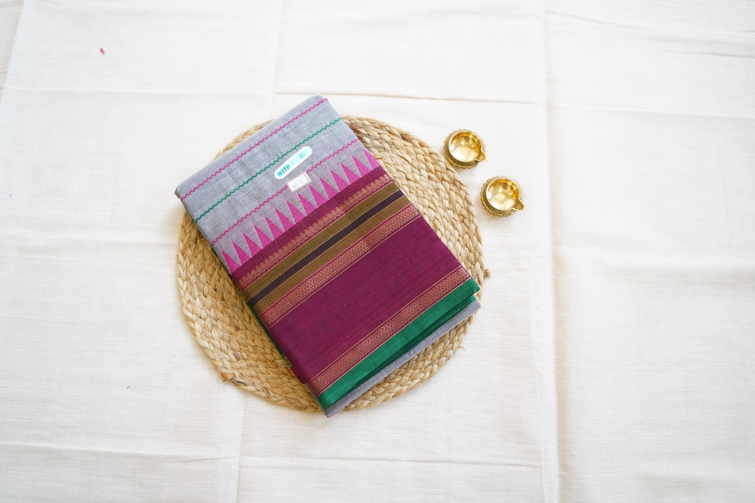 For Silk & Silk Cotton Sarees, Always dry clean for the first wash. For subsequent washes, if dry cleaning is not possible, gently hand wash in cold water with soapnut or silk-suitable detergent or baby shampoo.