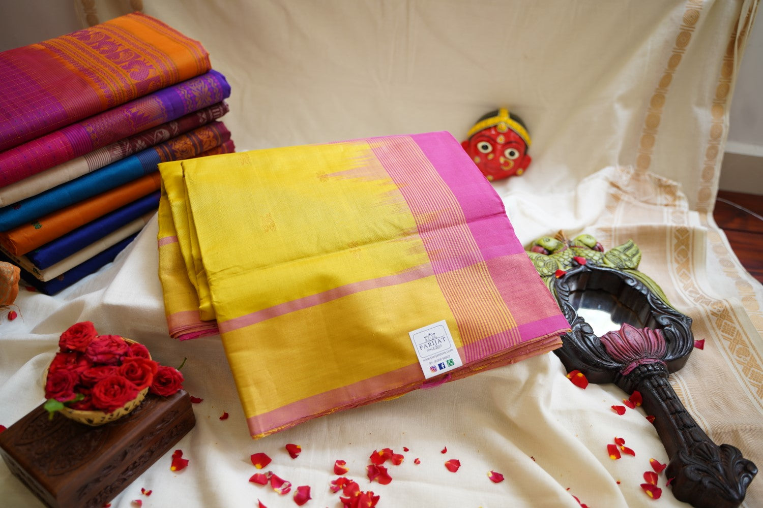 All Saree Photos are taken under sunlight. We do not modify the Pictures Digitally. Utmost Care and Effort is taken to achieve the exact colors of the sarees in the Pictures. All Pictures are intended to be best viewed on High Resolution Displays. The color rendition of the products may vary according to the ambient lighting conditions and the color calibration of digital LED devices. If you would like more clarity before your purchase, please contact us at +91 95000 94822 (Mon - Sat 9:30 am to 8:30 pm IST) or email us at parijatcollections@gmail.com