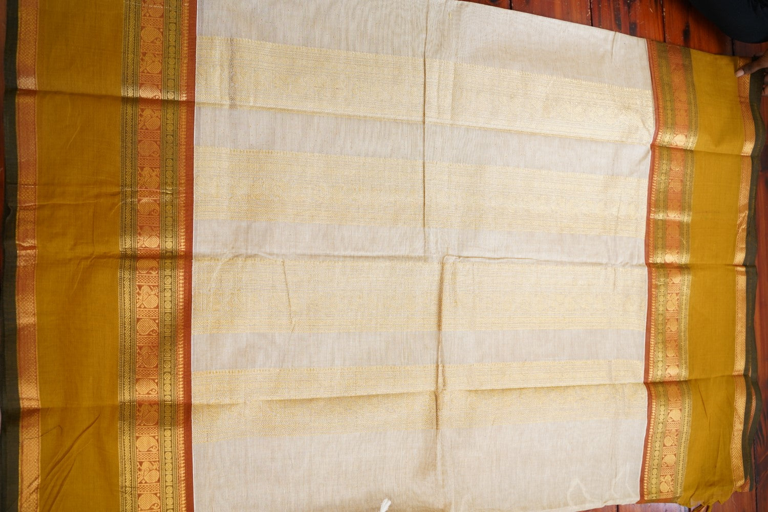 For Silk & Silk Cotton Sarees, Always dry clean for the first wash. For subsequent washes, if dry cleaning is not possible, gently hand wash in cold water with soapnut or silk-suitable detergent or baby shampoo.