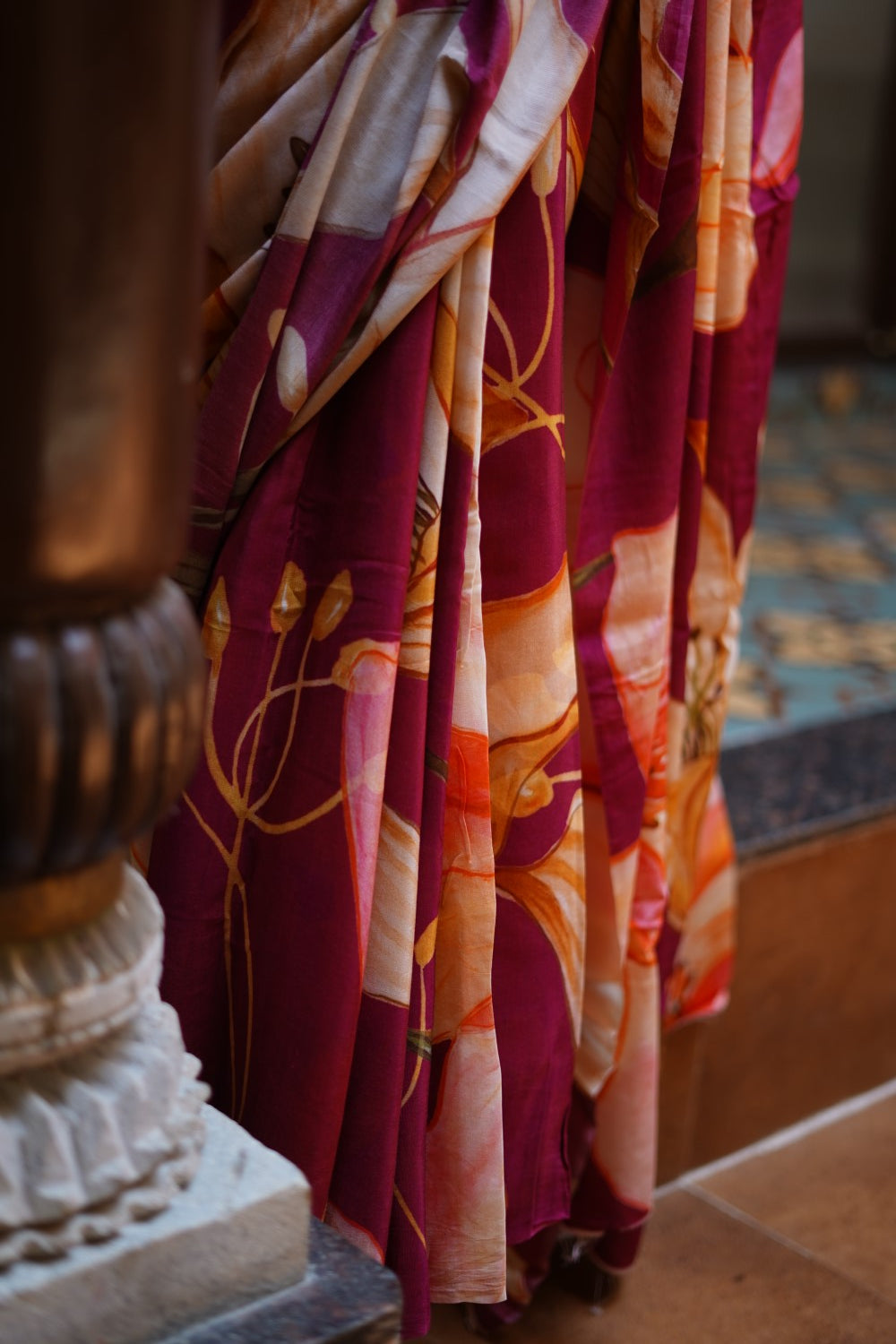 Always air dry the saree in shade. Never wring the sari or use it in the washing machine or dryer. Never rub the sari vigorously.