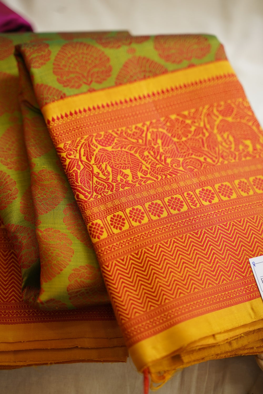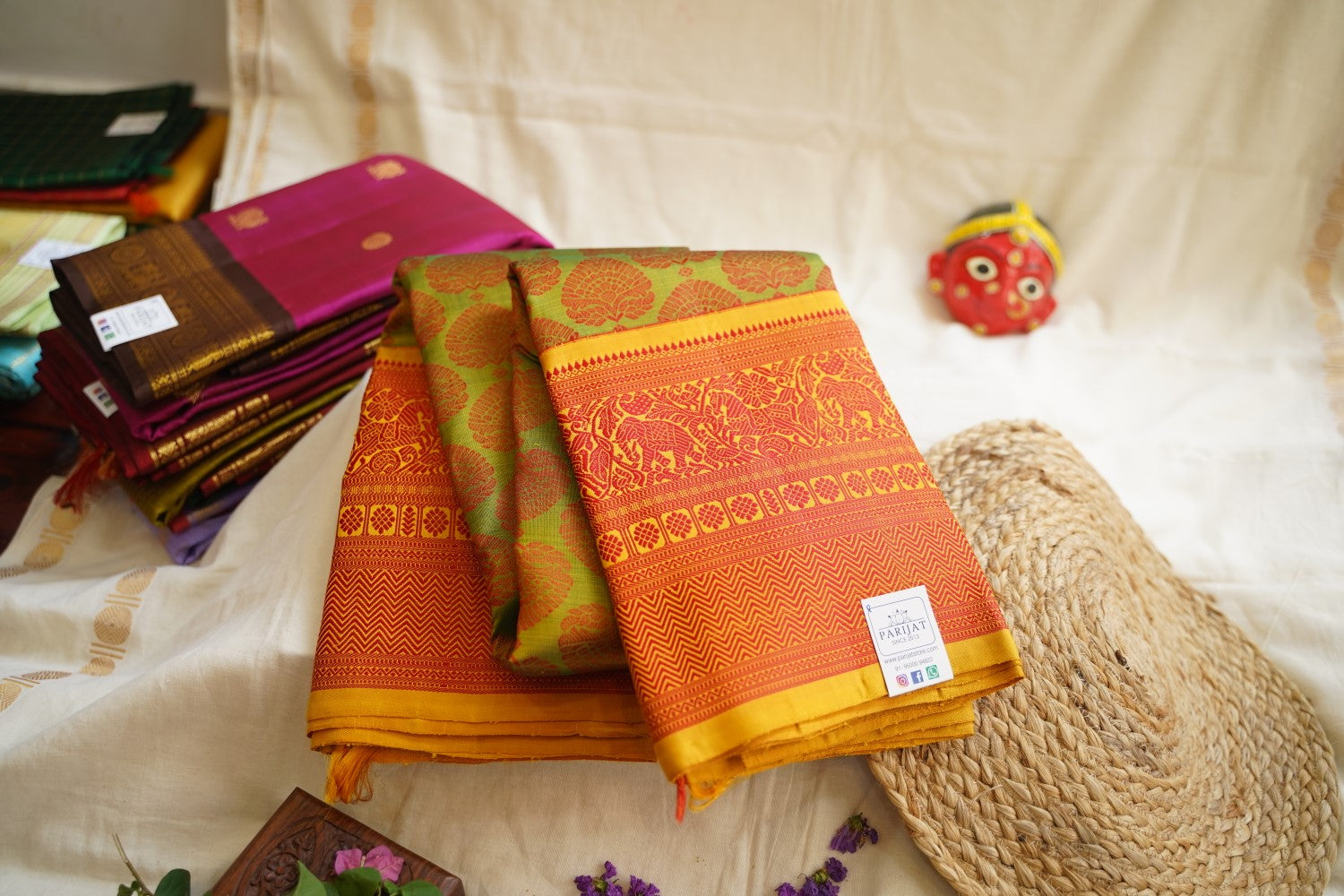 For Silk & Silk Cotton Sarees, Always dry clean for the first wash. For subsequent washes, if dry cleaning is not possible, gently hand wash in cold water with soapnut or silk-suitable detergent or baby shampoo.