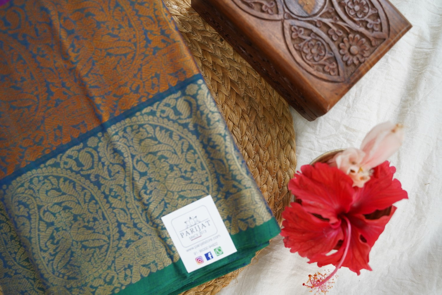 All Saree Photos are taken under sunlight. We do not modify the Pictures Digitally. Utmost Care and Effort is taken to achieve the exact colors of the sarees in the Pictures. All Pictures are intended to be best viewed on High Resolution Displays. The color rendition of the products may vary according to the ambient lighting conditions and the color calibration of digital LED devices. If you would like more clarity before your purchase, please contact us at +91 95000 94822 (Mon - Sat 9:30 am to 8:30 pm IST) or email us at parijatcollections@gmail.com