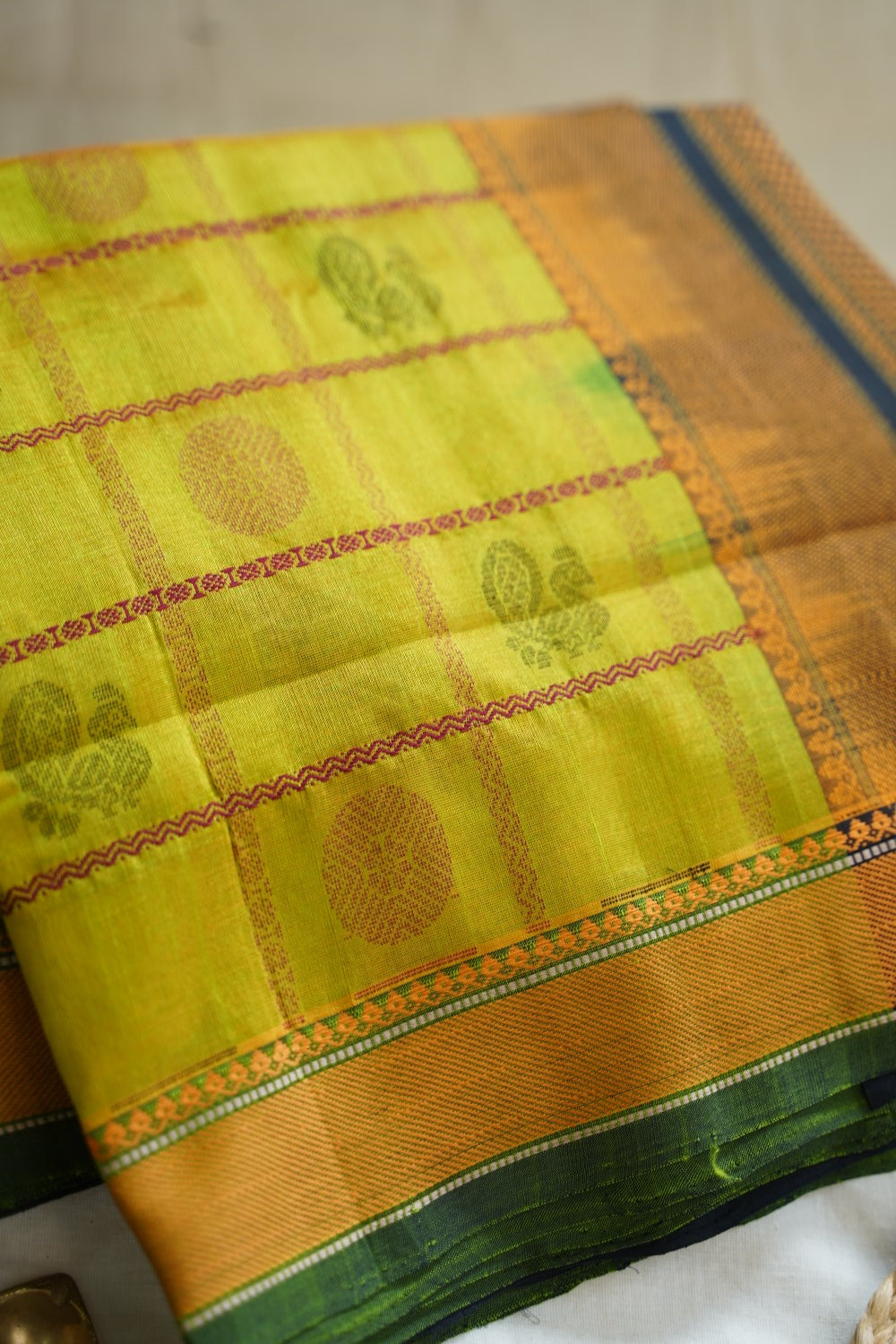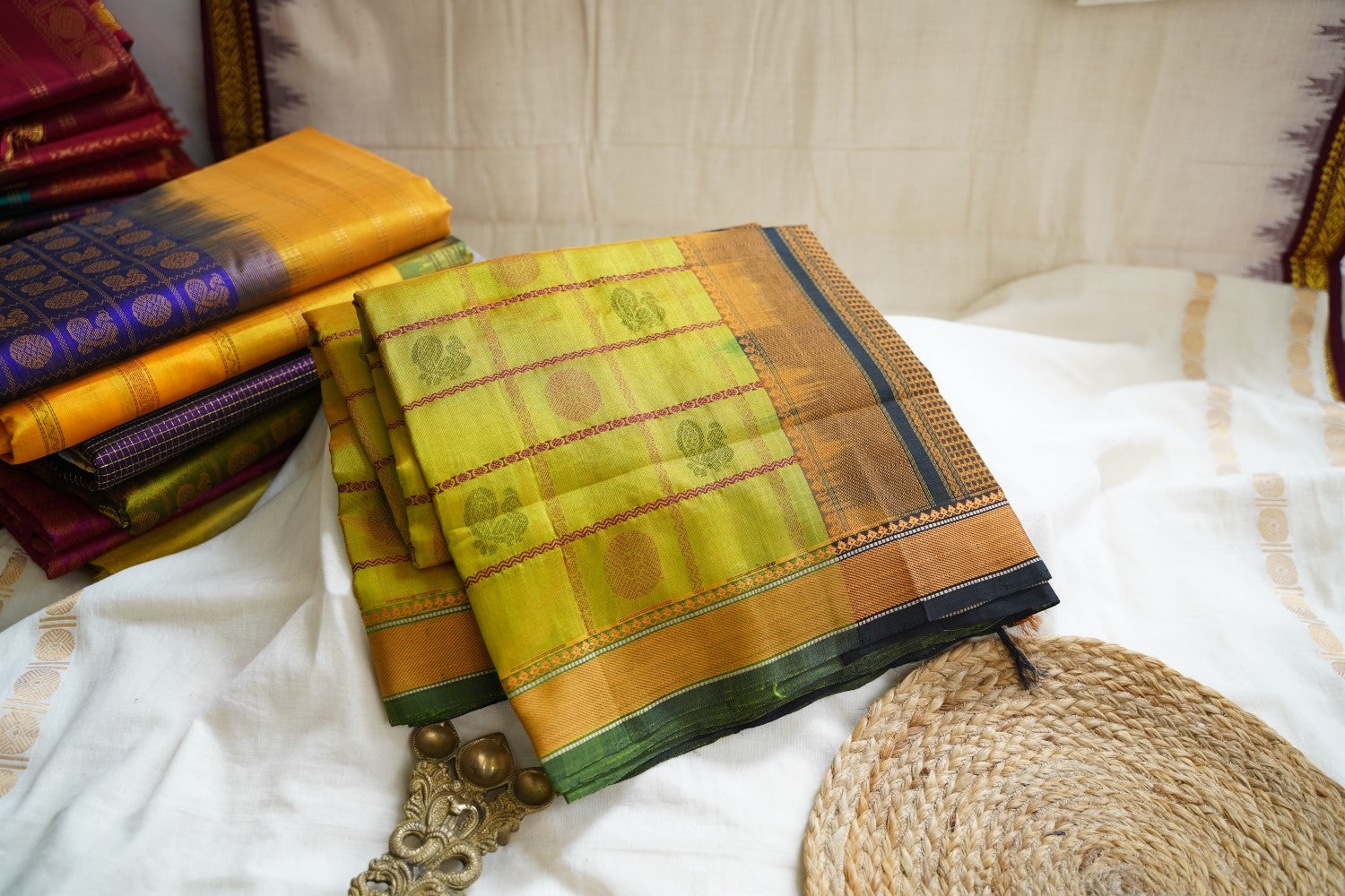 For Silk & Silk Cotton Sarees, Always dry clean for the first wash. For subsequent washes, if dry cleaning is not possible, gently hand wash in cold water with soapnut or silk-suitable detergent or baby shampoo.