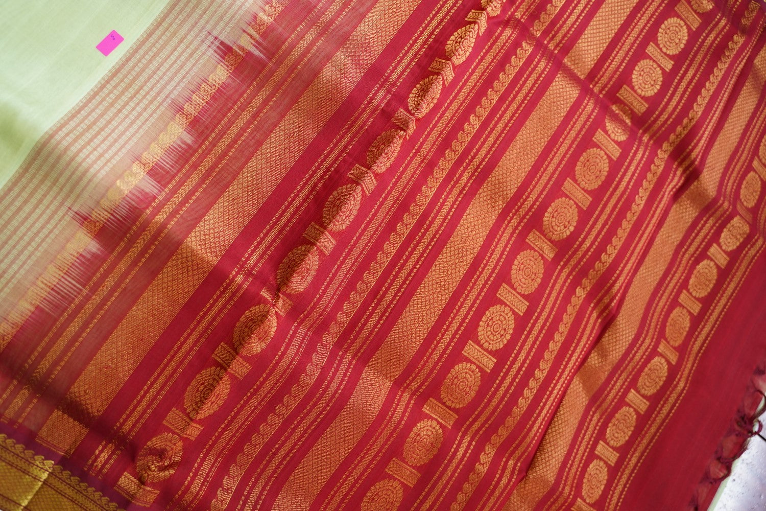 Always air dry the saree in shade. Never wring the sari or use it in the washing machine or dryer. Never rub the sari vigorously.