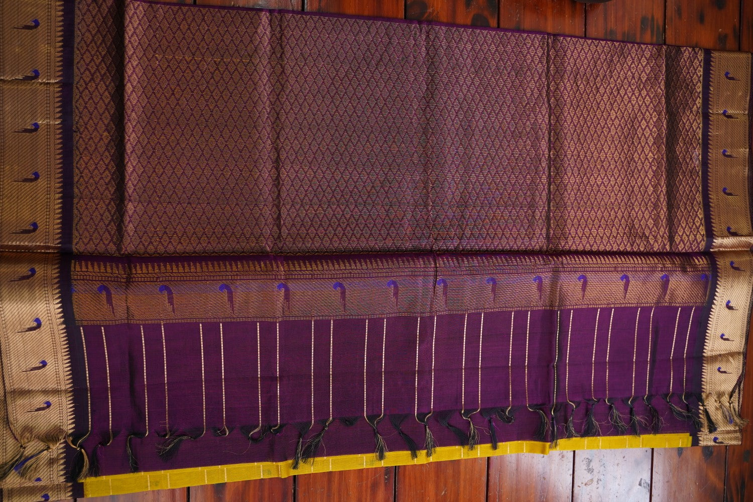 Always air dry the saree in shade. Never wring the sari or use it in the washing machine or dryer. Never rub the sari vigorously.