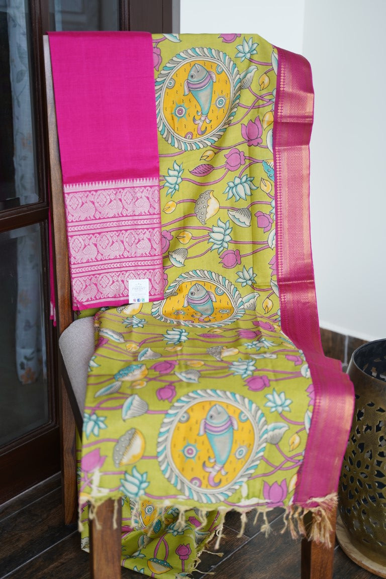 For Silk & Silk Cotton Sarees, Always dry clean for the first wash. For subsequent washes, if dry cleaning is not possible, gently hand wash in cold water with soapnut or silk-suitable detergent or baby shampoo.