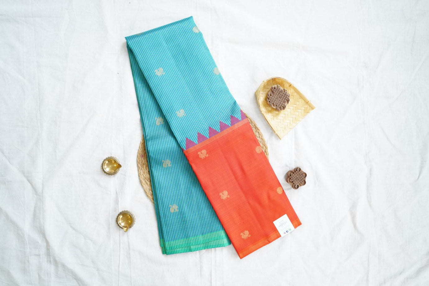 For Silk & Silk Cotton Sarees, Always dry clean for the first wash. For subsequent washes, if dry cleaning is not possible, gently hand wash in cold water with soapnut or silk-suitable detergent or baby shampoo.