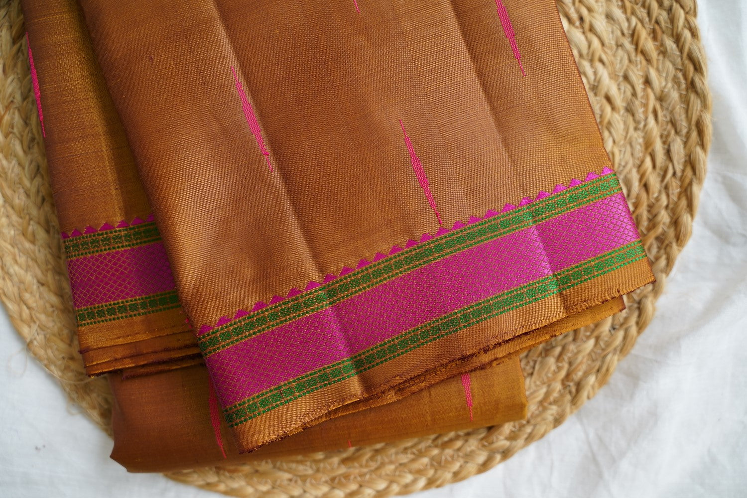 For Silk & Silk Cotton Sarees, Always dry clean for the first wash. For subsequent washes, if dry cleaning is not possible, gently hand wash in cold water with soapnut or silk-suitable detergent or baby shampoo.